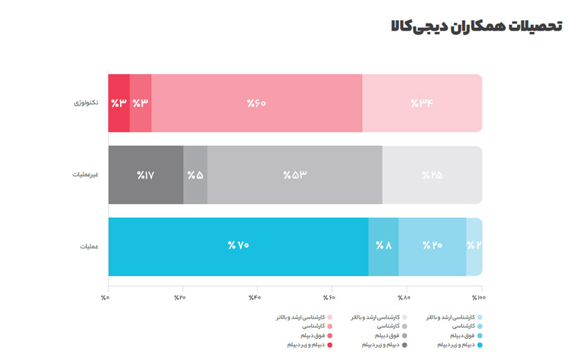 در آمارهای ارائه شده توسط دیجی کالا مشخص شده است که بخش غیرعملیات (بازاریابی، بازرگانی، مالی، منابع انسانی، حقوقی و…) و تکنولوژی بیش از ۷۹ درصد نیروها دارای مدرک کارشناسی و بالاتر هستند. این در حالی است که در بخش عملیاتی دیجی کالا بیشتر افراد شاغل (۷۰ درصد) دارای مدرک دیپلم و زیردیپلم هستند و فرصتهای شغلی در این حوزه برای افراد با این مدرک تحصیلی بسیار زیاد است.