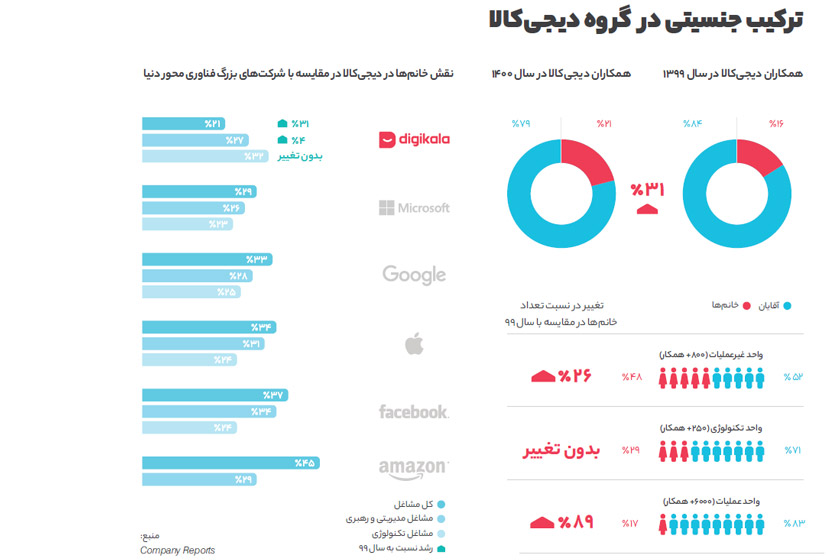این موضوع در دیجی کالا و طبق آمار نیم سال اول سال ۱۴۰۰ به این صورت است که تقسیم خانم و آقا در بخشهای مختلف و حتی در ردههای مدیریتی تقریبا رعایت شده است و محدودیتی در بکارگیری خانمها در کلیه تیمها و حتی تیمهای عملیاتی در این سازمان وجود ندارد. طبق آمار تیم منابع انسانی دیجی کالا، در حال حاضر ۲۱ درصد از کل نیروی انسانی دیجی کالا و ۲۷ درصد از مدیران دیجی کالا خانمها هستند، اما در برخی از مشاغل مانند کارهای عملیاتی تعداد خانمها نسبت به آقایان در دیجی کالا کمتر است.