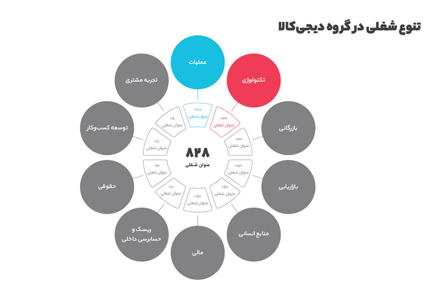 افزودن محصولات و خدمات جدید باعث به وجود آمدن شغلهای متنوع در این سازمان شده است. به همین خاطر در حال حاضر بیش از ۷۴۰۰ نیروی کار در دیجیکالا و زیرمجموعههای آن در ۸۲۸ موقعیت شغلی متفاوت مشغول به کار هستند. با توجه به اینکه کار اصلی دیجی کالا فروش آنلاین کالا است، میتوان توقع داشت که بیشتر مشاغل این سازمان به حوزه آنلاین مانند فروش، تکنولوژی، مارکتینگ و همچنین بخش توزیع و پخش ربط داشته باشد. در تصویر زیر میتوانید تنوع شغلی در دیجی کالا را مشاهده کنید: