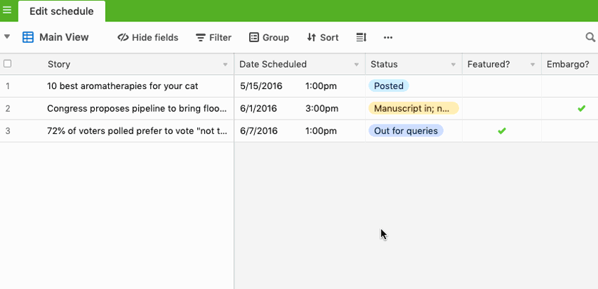 به زبان ساده، ساختار کلی این ابزار شبیه ساختار یک spreadsheet زیبا برای کسب و کارتان است که تمام پروژههای در حال انجام شما را متمایز و مشخص میکند. اما در این ابزار به جای اینکه فقط بتوانید ردیفها را ویرایش کنید، میتوانید بر روی ستونها نیز ویرایش انجام دهید. بنابراین، در یک تقویم محتوایی، مانند تقویم زیر، میتوانید ستونهایی برای تاریخ داشته باشید… ستونی برای زمان متوقف شدن نوشتن داشته باشید… ستونی برای نام نویسنده داشته باشید… ستونی برای یادداشت ویراستار داشته باشید… و اطلاعات مهم دیگری که برای داشتن برنامهی مرتب به آن نیاز دارید، در آن قرار دهید.
