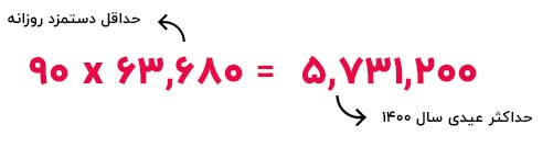اگر مبلغ ۶۳,۶۸۰ تومان که مبلغ دستمزد روزانه در سال ۹۹ است را در معادله زیر قرار دهیم، به مبلغ سقف عیدی سال ۱۴۰۰ خواهید رسید: