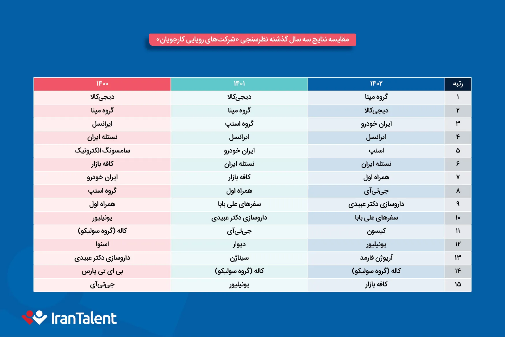 برای مشاهده جزئیات بیشتر و بررسی امتیازات کامل گروههای شعلی مختلف به شرکتها، میتوانید گزارش «جذابترین کارفرمایان ایران» را از سایت ایرانتلنت دانلود کنید.