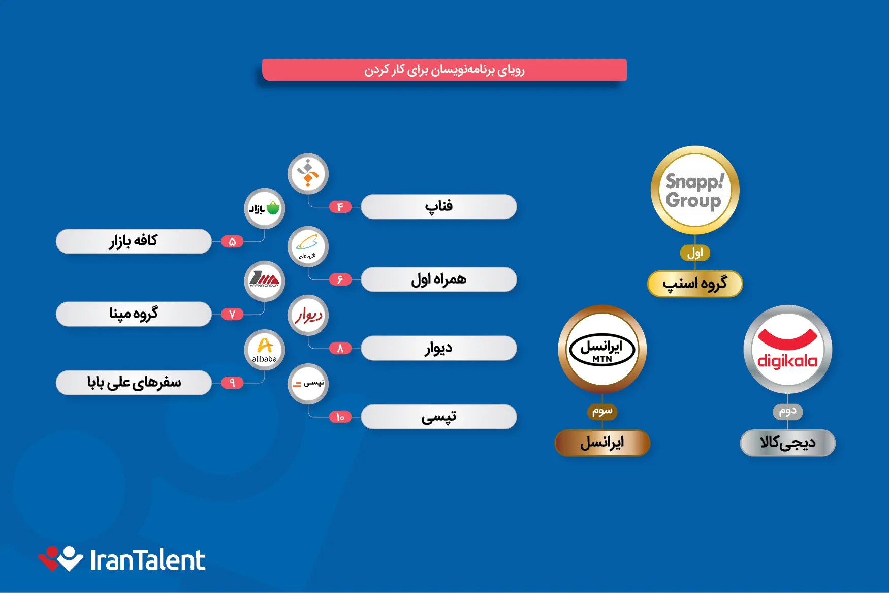 طبق نتایج به دست آمده نظرسنجی ایرانتلنت، برنامهنویسان شرکتهای «اسنپ»، «دیجیکالا» و «ایرانسل» را به عنوان انتخاب اول برای کار، اعلام کردهاند: