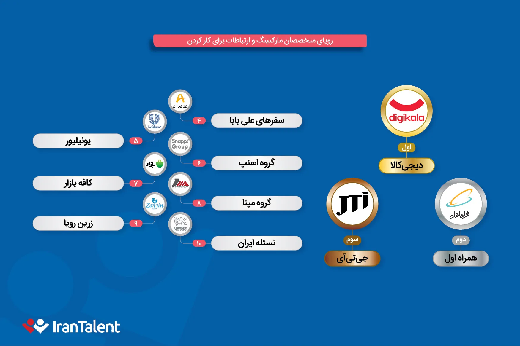 برای فعالین در شاخههای مختلف مارکتینگ و ارتباطات، دیجیکالا گزینه اول برای کار کردن است. از دیگر شرکتهای مورد علاقه این گروه شغلی میتوان به همراه اول، جیتیآی و علیبابا اشاره کرد: