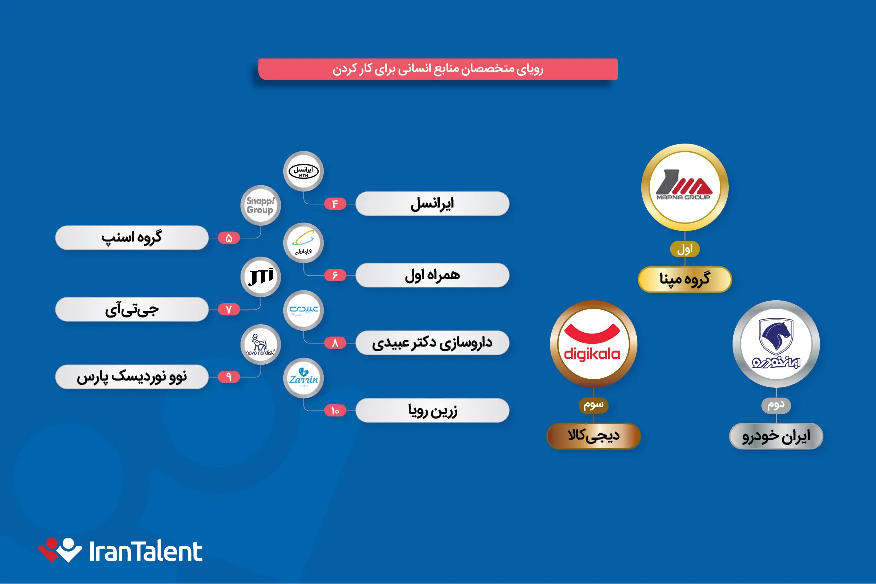 شاید برایتان جالب باشد که متخصصین منابع انسانی که خودشان در کار جذب و استخدام هستند، ترجیح میدهند در کدام شرکتها کار کنند. گروه مپنا انتخاب اول فعالین حوزه منابع انسانی برای کار کردن است. شرکت ایرانخودرو انتخاب دوم این دسته از افراد است و دیجیکالا نیز گزینه سوم آنها برای کار کردن است: