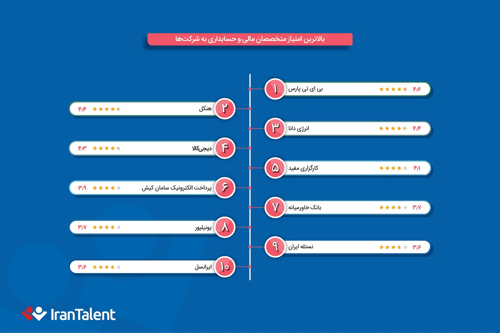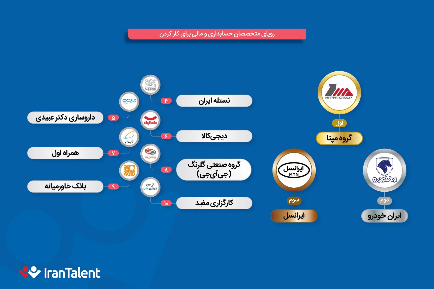 گروه مپنا توانسته نظر حسابداران و فعالین حوزه مالی را نیز به خود جلب کند چون حسابداران این شرکت را به عنوان گزینه اول و ایدهآل خود برای کار کردن معرفی کردهاند. شرکتهای ایرانخودرو، ایرانسل، نستله و داروسازی دکتر عبیدی نیز در رتبههای بعدی قرار گرفتهاند: