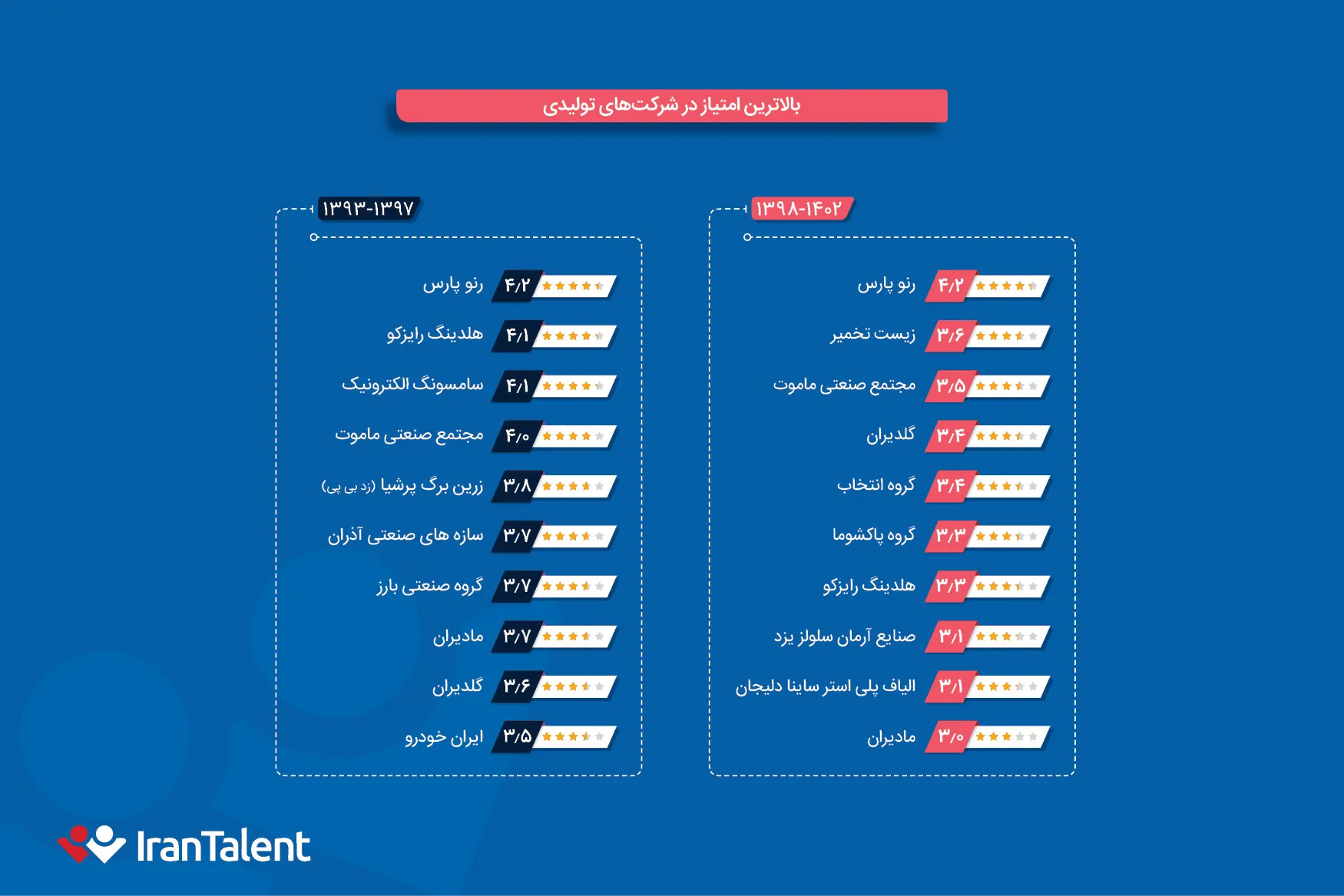 در صنعت تولیدی کارکنان شرکت «رنو پارس» بیشترین رضایت را از محیط کارشان داشتند و بالاترین امتیاز را به این شرکت دادهاند. «زیست تخمیر» و «مجتمع صنعتی ماموت» نیز در آخرین دوره ارزیابی شرکتها در در جایگاه دوم و سوم صنایع تولید و فرایند قرار گرفتهاند.