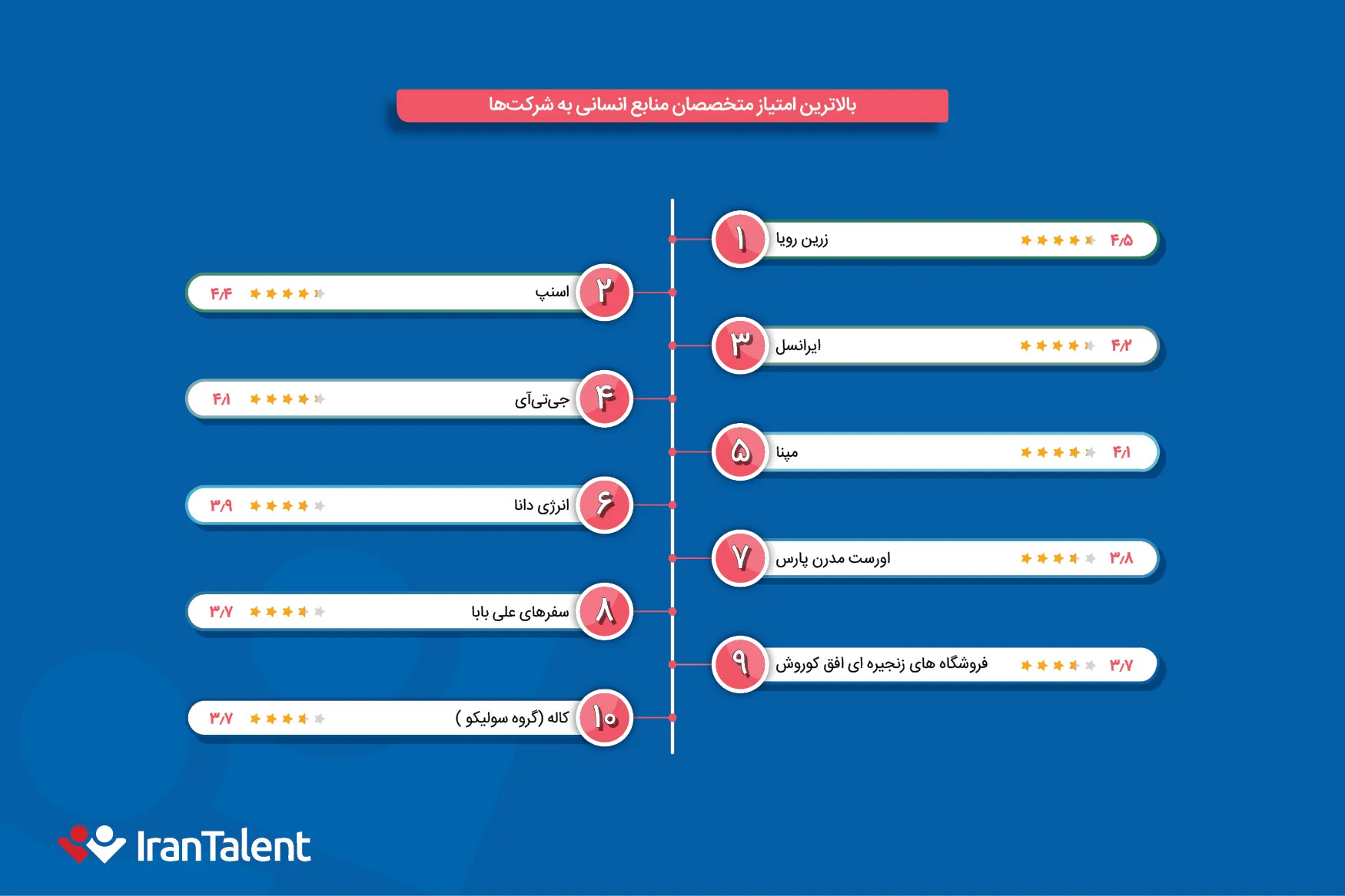 متخصصان منابع انسانی که تجربه همکاری با شرکت «زرین رویا» را داشتهاند، بالاترین امتیاز را به این شرکت دادهاند. شرکتهای، «ایرانسل»، «جیتیآی»، «گروه مپنا» و «اسنپ» نیز بالاترین امتیاز را در این حوزه کاری دریافت کردهاند: