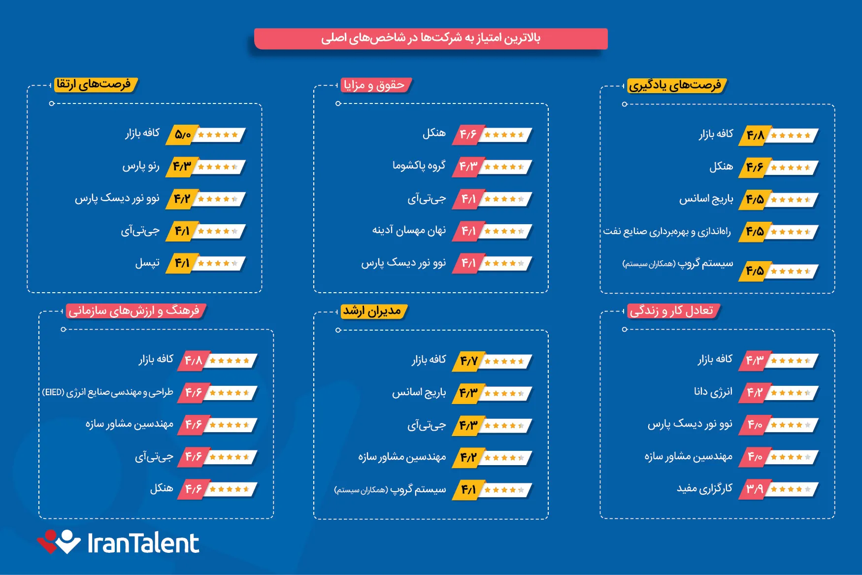کاربران ایران تلنت در قسمت تجربههای کاری، به شش فاکتور «حقوق و مزایا»، «فرصتهای ارتقا»، «تعادل کار و زندگی»، «مدیران ارشد»، «فرصتهای یادگیری» و «فرهنگ و ارزشهای سازمانی» به صورت جداگانه امتیاز میدهند. در ادامه شرکتهای برتر که در چهار سال اخیر در هر شاخص بیشترین امتیاز از کارکنانشان دریافت کردهاند، را معرفی میکنیم: