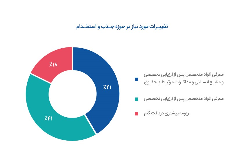بخش بعدی این گزارش به تغییرات مورد نیاز در حوزه جذب و استخدام متناسب با نیاز سازمانها پرداخته شده است. جالب اینجاست که تنها ۱۸ % از افراد تمایل به دریافت رزومه بیشتر داشتهاند و «معرفی افراد متخصص پس از ارزیابی تخصصی و منابع انسانی و مذاکرات مرتبط با حقوق» و همینطور «معرفی افراد متخصص پس از ارزیابی تخصصی» با درصد یکسان ۴۱% مهمترین تغییرات مورد نیاز سازمانها در حوزه جذب و استخدام بوده است.