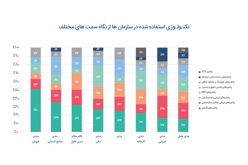 در قسمت بعدی این گزارش به همین موضوع از نگاه سمتهای مختلف پرداخته شده است. این جدول مشخص میکند که مدیران فروش و مدیران منابع انسانی بیش از سایرین از «پلتفرمهای کاریابی» استفاده میکنند. برای مدیران عامل و مدیران اجرایی مهمترین تکنولوژی مورد استفاده در حوزه منابع انسانی «پلتفرمهای ارزیابی عملکرد و عارضهیابی» است. مدیران مالی و مدیران کارخانههای نیز بیش از سایرین از «پلتفرمهای ERP» استفاده میکنند.