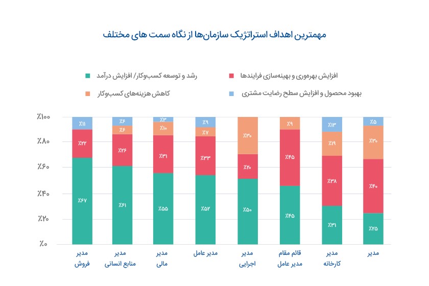 در این گزارش مهمترین اهداف استراتژیک سازمانها از نگاه سمتهای مختلف نیز مورد بررسی قرار گرفته است. مهمترین هدف استراتژیک برای مدیران عامل، مدیران مالی، مدیران منابع انسانی، مدیران فروش، «رشد و توسعه کسبوکار/ افزایش درآمد» بوده است. اما برای مدیران کارخانهها بیش از افزایش درآمد، «افزایش بهرهوری و بهینهسازی فرایندها» مهم بوده و مهمترین هدف آنها برای سال جدید است: