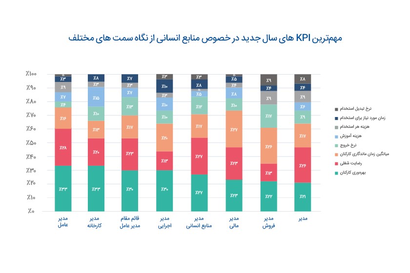 در بخش بعدی این گزارش مهمترین KPIهای سال جدید منابع انسانی از نگاه سمتهای مختلف مورد بررسی قرار گرفته است. اولویت اصلی مدیران عامل شرکتها نیز دو فاکتور «بهرهوری کارکنان» و «رضایت شغلی» است. «میانگین زمان ماندگاری» و «هزینه هر استخدام» نیز دو شاخص کلیدی عملکرد مدیران عامل در زمینه منابع انسانی است. در جدول زیر مهمترین KPIهای سال جدید منابع انسانی از نگاه سمتهای مختلف مشخص شده است: