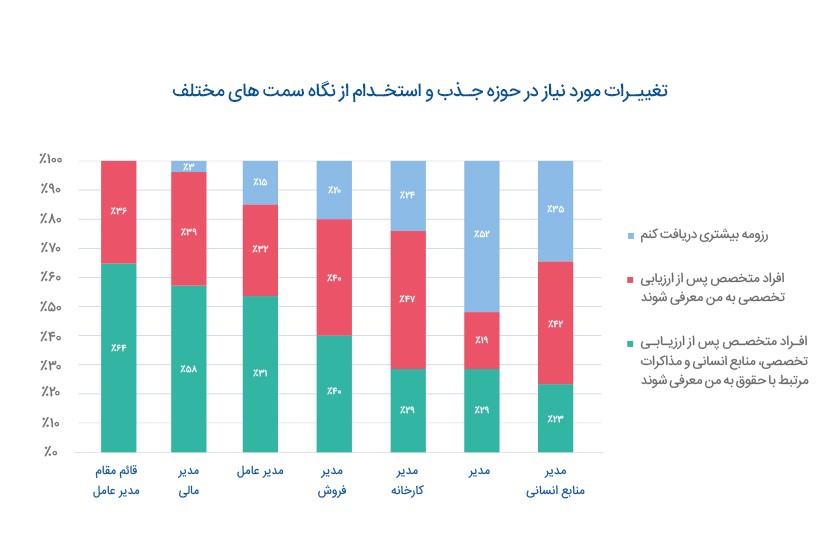 در این گزارش همچنین به تغییرات مورد نیاز در حوزه جذب و استخدام از نگاه سمتهای مختلف نیز پرداخته شده است. مهمترین تغییر مورد نیاز برای مدیران عامل، مدیران مالی و قائممقامان مدیر عامل، «معرفی افراد متخصص پس از ارزیابی تخصصی و منابع انسانی و مذاکرات مرتبط با حقوق» بوده است:
