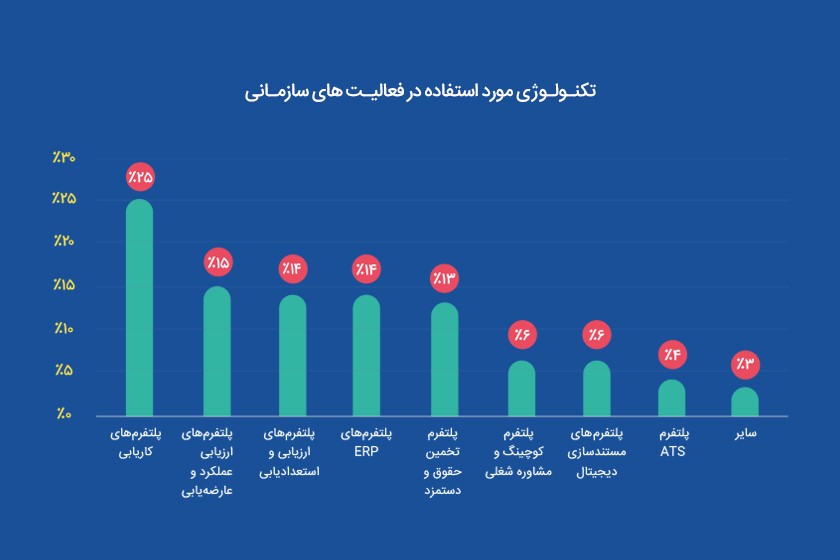 در قسمت بعدی این گزارش از شرکتکنندگان پرسیده شده است که مهمترین تکنولوژی مورد استفاده در منابع انسانی چیست؟ بر این اساس «پلتفرمهای کاریابی» با ۲۵ % در رتبه اول قرار گرفته است. «پلتفرمهای ارزیابی عملکرد و عارضهیابی» در رتبه دوم قرار گرفته و «پلتفرمهای ارزیابی و استعدادیابی» در رتبه سوم مهمترین تکنولوژیهای مورد استفاده در منابع انسانی قرار گرفته است. در رتبههای بعدی نیز به مواردی چون «پلتفرمهای ERP»، «پلتفرم تخمین حقوق و دستمزد»، «پلتفرم کوچینگ و مشاوره شغلی» و «پلتفرمهای ATS» اشاره شده است.