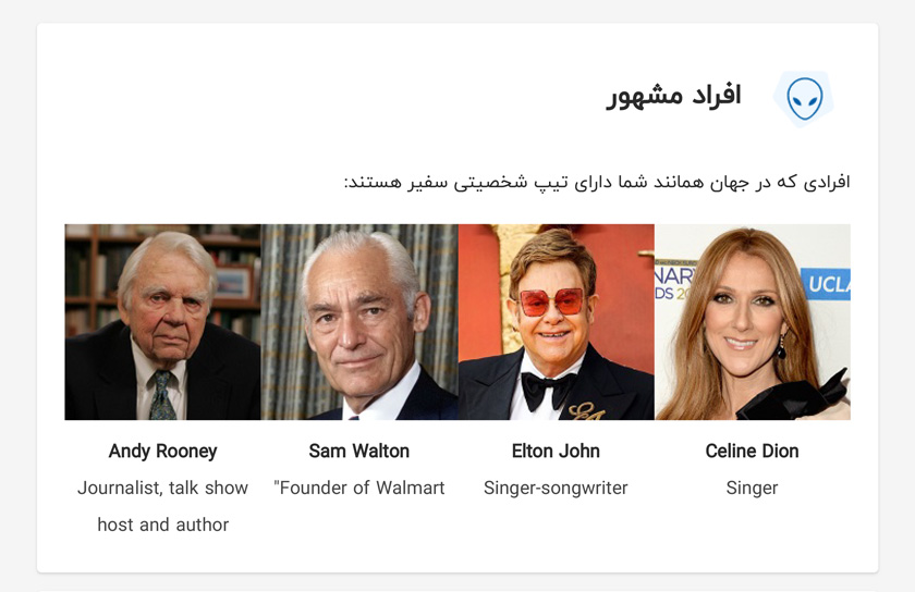 نکته جالب درباره این تست این است که افراد مشهور و بزرگ در دنیا که دارای تیپ شخصیتی شما هستند را معرفی میکند و حتی میتوانید از این شباهت تیپ شخصیتی، برای برخی تصمیمات کاری استفاده کنید و از این افراد الهام بگیرید.