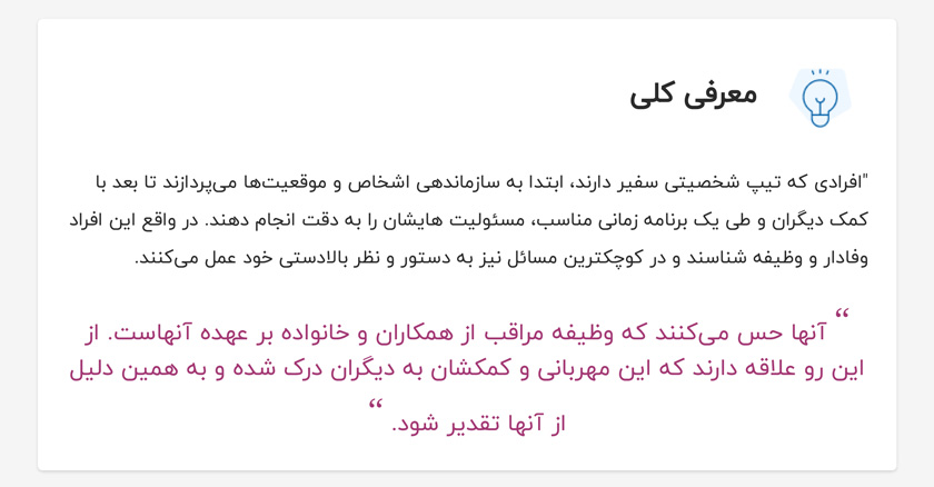 در ادامه معرفی کلی از تیپ شخصیتی خود را مشاهده میکنید و با تواناییها، روحیات و آنچه یک فرد سفیر در تعامل با محیط و افراد اطراف خود انجام میدهد، آشنا میشوید.