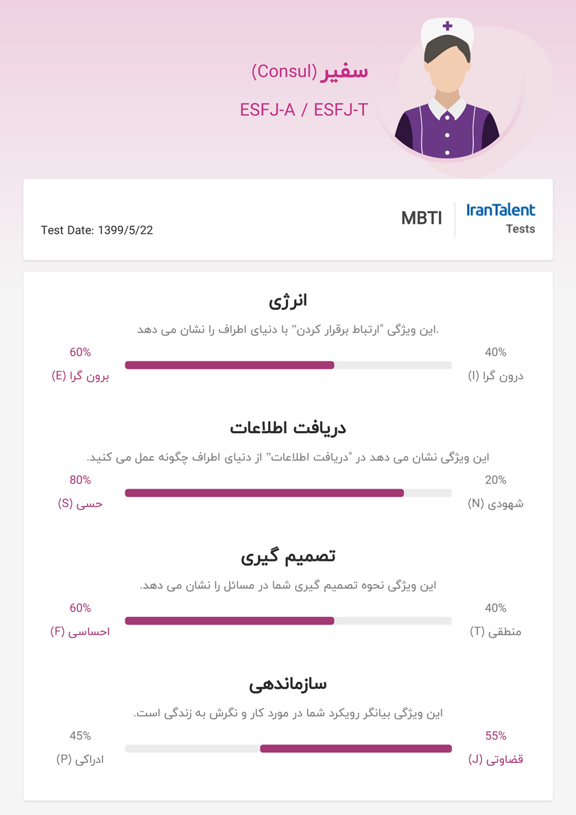 همانطور که در تصویر بالا مشاهده میکنید، تیپ شخصیتی شما بعد از پایان تست و پاسخ دادن به سوالات آن مشخص میشود. در نمونه بالا تیپ شخصیتی به دست آمده سفیر است که میزان انرژی (که این ویژگی “ارتباط برقرار کردن“ با دنیای اطراف را نشان میدهد)، دریافت اطلاعات (که این ویژگی نشان میدهد در “دریافت اطلاعات“ از دنیای اطراف چگونه عمل میکنید)، تصمیم گیری (که این ویژگی نحوه تصمیم گیری شما در مسائل را نشان میدهد) و سازماندهی (که این ویژگی بیانگر رویکرد شما در مورد کار و نگرش به زندگی است) شما را بر اساس ۴ معیارهای اصلی که در بالا عنوان کردیم، مشخص میکند.