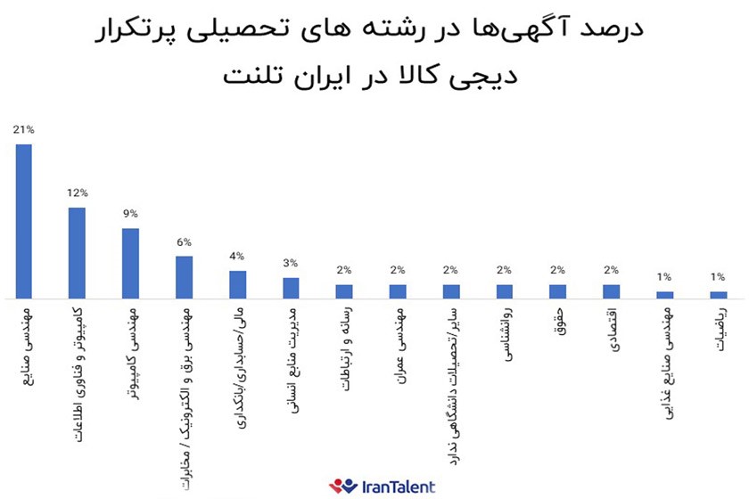 در آگهیهای استخدامی دیجی کالا در ایران تلنت به رشتههای تحصیلی که بیشترین تقاضا را در سال ۱۴۰۰ و در میان فرصتهای شغلی داشتند رسیدیم. این رشتههای تحصیلی عبارتاند از: