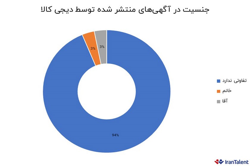 تصویر بالا کاملا نشان میدهد که در ۹۴ درصد از آگهیهای استخدامی دیجی کالا که در ایران تلنت منتشر شده است، جنسیت معنا و مفهومی ندارد و فیلتری با این مضمون برای آنها مشخص نشده است. درصد آگهیهای منتشر شده مختص خانمها و آقایان در ایران تلنت نیز ۳ درصد برای هر کدام بوده است.