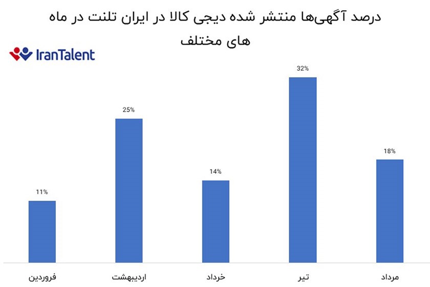 در نمودار بالا میتوان مشاهده کرد در دو ماه تیر و اردیبهشت دیجی کالا بیشترین میزان آگهی را در ایران تلنت منتشر کرده است تا بتواند به افراد مد نظر خود در آن موقعیتهای شغلی برسد. همچنین باید عنوان کرد که، طبق آمارهای دیجی کالا به طور متوسط، بیش از ۱۶ درصد افرادی که در مصاحبه شغلی دیجی کالا شرکت کردهاند در نهایت استخدام شدند.