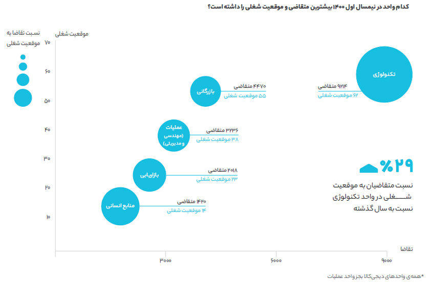 البته این موضوع در هر شرکتی دیده میشود که هر سال و با توجه به نیاز شرکت، مشاغل و میزان استخدام در آنها تغییر کند. در مورد دیجی کالا هم این موضوع صدق میکند و ممکن است تعدد استخدام و کارمند در برخی بخشها و در برخی سالها متفاوت باشد. اما با این حال ماهیت کاری دیجی کالا، همیشه باعث میشود که تعداد تقاضا در برخی مشاغل خاص مانند بازاریابی و تکنولوژی بیشتر باشد.
