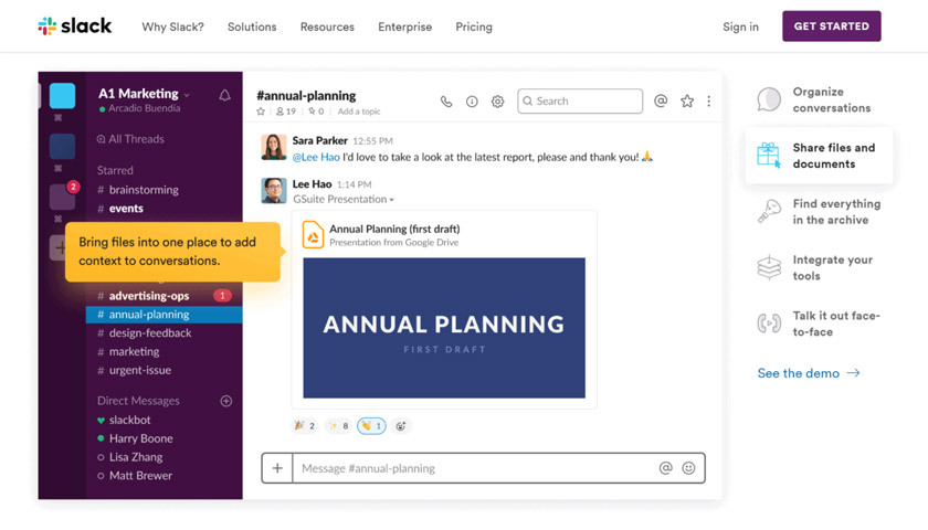 همچنین، توسط Slack میتوانید اشتراک گذاری فایل را نیز انجام دهید. میتوانید مستقیماً فایلهایی را برای تیم خود ارسال کنید، که در اصل بسیار راحتتر و تمیزتر از ایمیل عمل میکند. اسلک با گوگل درایو نیز ادغام میشود.