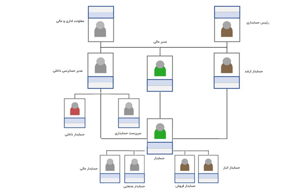 نمودار زیر نمایی کلی از نحوه چیدمان نقشهای این قسمت در شرکت را نشان میدهد. چارت سازمان مربوط به قسمت مالی هر شرکت ممکن است نسبت به بزرگی و کوچک بودن هر سازمان بزرگتر و کوچکتر شود.