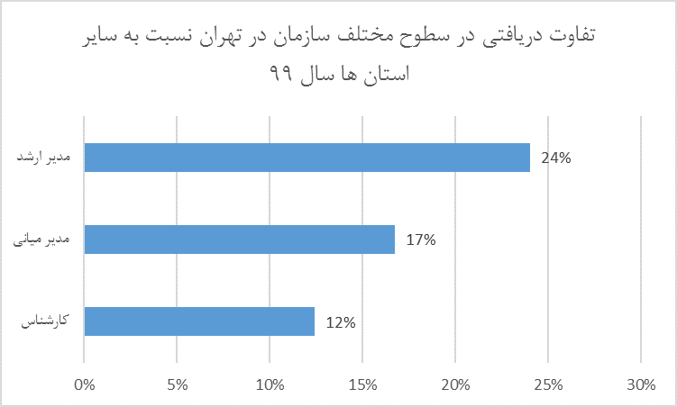 با توجه به نمودارهای بالا در سال ۹۹ تفاوت دریافتی افراد در سطوح مختلف سازمان در تهران نسبت به سایر استان ها در سطوح کارشناسی ۱۲%، مدیر میانی ۱۷% و مدیر ارشد ۲۴% می باشد این در حالی است که تفاوت دریافتی مدیران میانی تهران نسبت به شهرستان در سال ۹۸، ۲۱% بوده است.