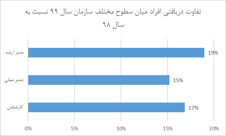 در جدول بالا میزان تفاوت دریافتی در سال ۹۹ نسبت به سال ۹۸ در سطوح مختلف به دست آمده است. در هر سه مورد تقریبا تفاوت بین ۱۵ تا ۲۰ درصد تفاوت در سال ۹۹ گزارش شده است که سهم مدیران ارشد در این تفاوت دریافتی نسبت به سال گذشته بیشتر بوده است.