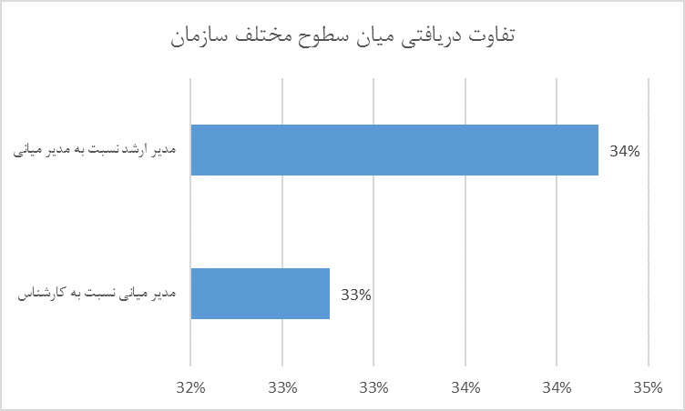 نمودار بالا میزان تفاوت دریافتی میان سطوح مختلف سازمان در سال ۹۹ را نشان میدهد. با توجه به میزان اهمیت مشاغل در کسب و کارهای مختلف این میزان تفاوت در سطوح مختلف انتظار میرود. مدیر ارشد به نسبت مدیر میانی سازمان به میزان ۳۴ درصد دریافتی بیشتری دارد و این در حالی است که مدیر میانی نسبت به کارشناس ۳۳ درصد بیشتر حقوق دریافت میکند.