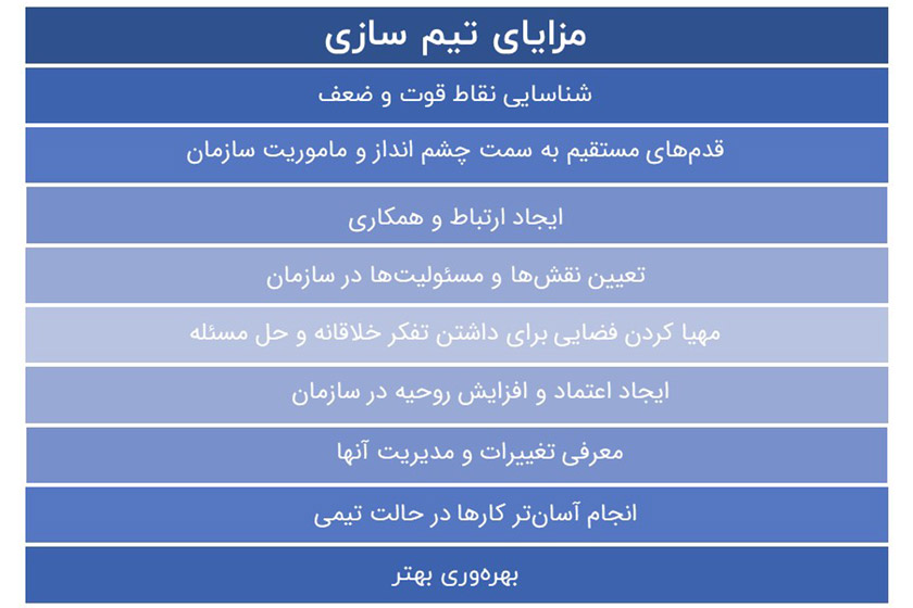 بهرهوری بهتر: اگر تیم عاقلانه شکل بگیرد و همه اعضای تیم به طور مشترک برای رسیدن به اهداف تلاش کنند، بهرهوری همه افراد بهبود مییابد. بنابراین، افزایش بهرهوری تیم باعث افزایش بهرهوری در سازمان میشود.
