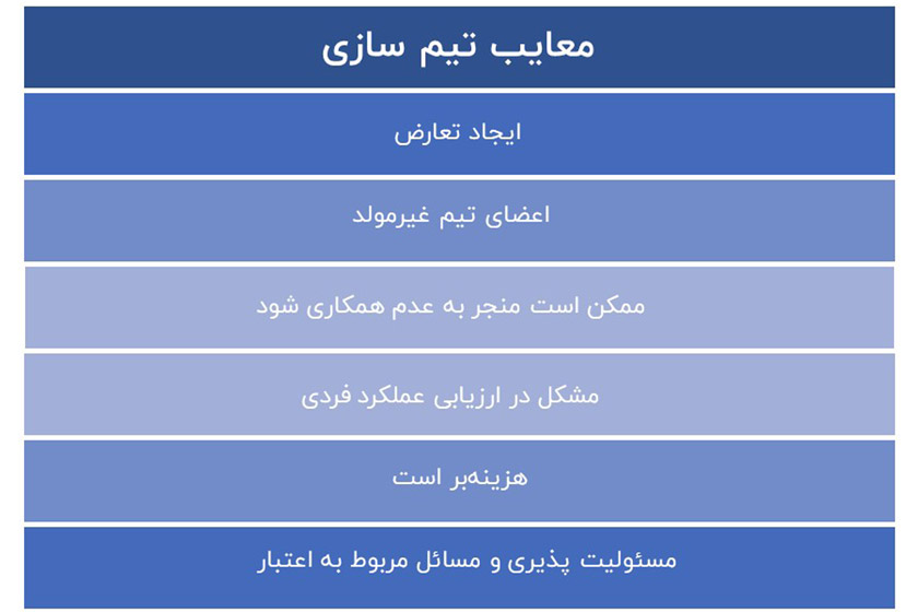 بنابراین، میتوان گفت که تیم سازی میتواند برای برخی سازمانها معایبی به همراه داشته باشد که این معایب عبارتاند از: