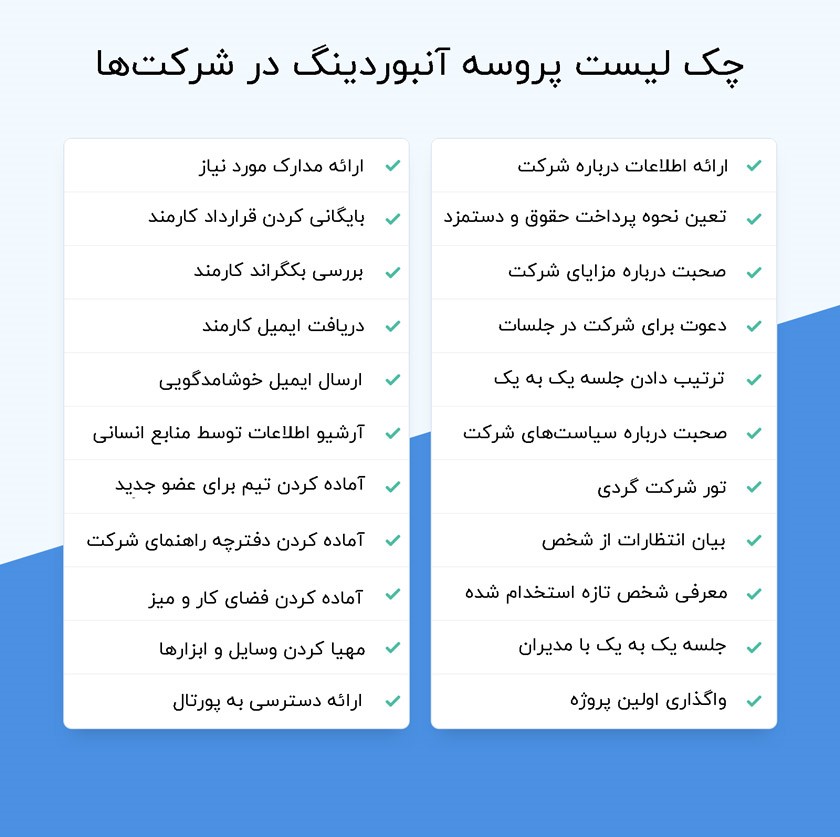 در اینجا شما میتوانید چک لیستی از آنچه در پروسه آنبوردینگ مورد نیاز است را مشاهده کنید.