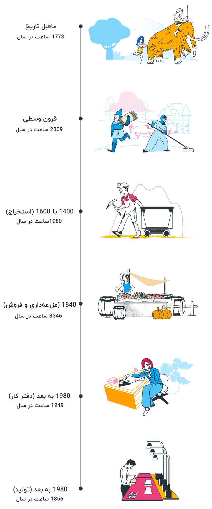 با توجه به اینکه بیشتر کشورها در تاریخهای مشخص شده در تصویر بالا، تقریبا کارهای یکسانی داشتند و حتی در زمان ماقبل تاریخ نیز روند انجام کارها یکسان بوده، میتوانیم این میزان ساعت کاری در سال را برای ایران آن زمان در نظر بگیریم. البته که ممکن است میزان آن کمی بالا و پایین داشته باشد، اما میتوان از تصویر بالا به حدود ساعت کاری سالانه در سالهای قبل رسید.