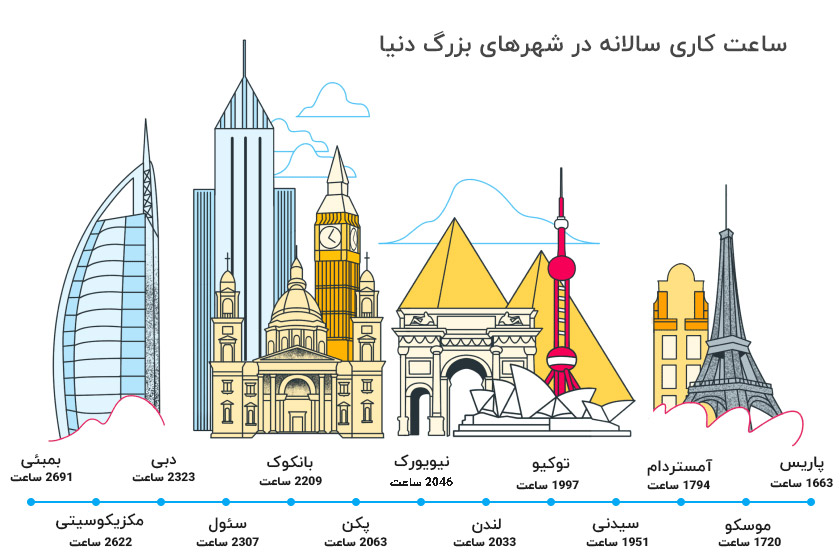 همانطور که در تصویر بالا مشخص است، در میان شهرهای بزرگ و پرجمعیت دنیا این بمبئی است که بیشتری ساعت کاری سالانه را ثبت کرده است و پاریس با ۱۶۶۳ ساعت در سال، کمترین میزان ساعت کاری را به خود اختصاص داده است..