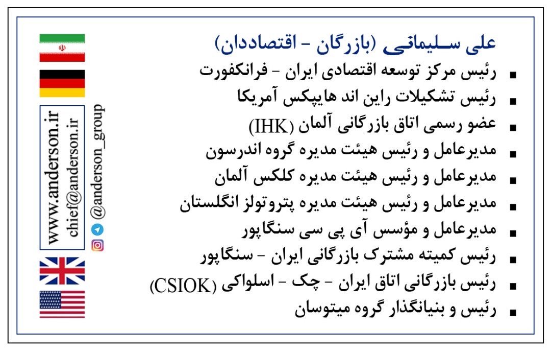 Anderson as a corporate group enjoys 27 years of experience in offering trading services to its customers around the word; The Company was registered under registration number of 482991 and Economic Code of 4114439739 Dozens of registered trademarks in Iran and EU shows the size of this company and one of the trademarks is ANDERSON, Anderson Group is active in a wide range of activities, including Fintech, Ecommerce, Epcc, Food industry, FMCG and some other fields. The group’s Headquarters is located at Jordan Ave, and there are numerous other buildings across the country for Anderson’s various activities Several warehouses, permanent exhibitions, as well as several stores in the market are other Anderson facilities that help the company to achieve its high goals. Anderson Group enjoys Business Offices in some of European and Asian countries and with the benefits of experienced managers, committed & professional members and well organized collection, today has introduced themselves as one of the most successful trading-engineering companies in the world and is known as a famous brand and a reliable International company from Persia.