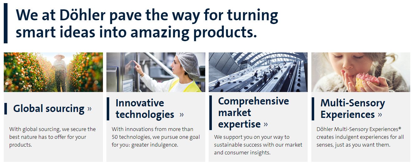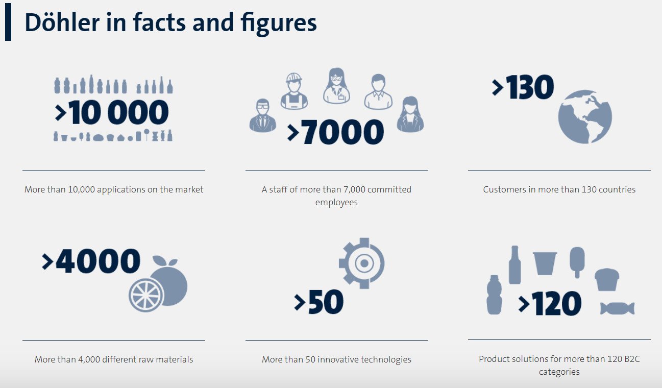 Döhler is a global producer, marketer and provider of technology-driven natural ingredients, ingredient systems and integrated solutions for the food and beverage industry. Döhler’s integrated approach and the broad product portfolio are the optimal basis for innovative and safe food & beverage applications. The product portfolio of natural ingredients ranges from natural flavors, natural colors, health ingredients, pulses & cereal ingredients, dairy & plant-based ingredients, fermented ingredients, dry fruit & vegetable ingredients, fruit & vegetable ingredients to ingredient systems. Top quality and the best taste sensations stemming from tradition since 1838. It all started almost 180 years ago with a spice mill. Today, Döhler is a global producer, marketer and provider of technology-driven natural ingredients, ingredient systems and integrated solutions for the food and beverage industry. Innovation, trust, quality and sustainability are the values that characterize our company, and that we are proud of.