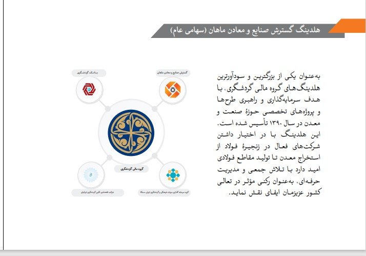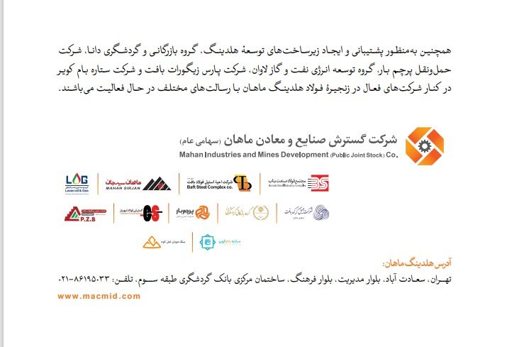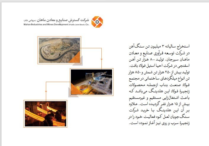 Mahan Mines and Industries Development Company (PLC), as one of the major investment companies of Tourism Financial Group, has been established with the aim of investment in specialized plans and projects of the Industries and Mines domain in the country.